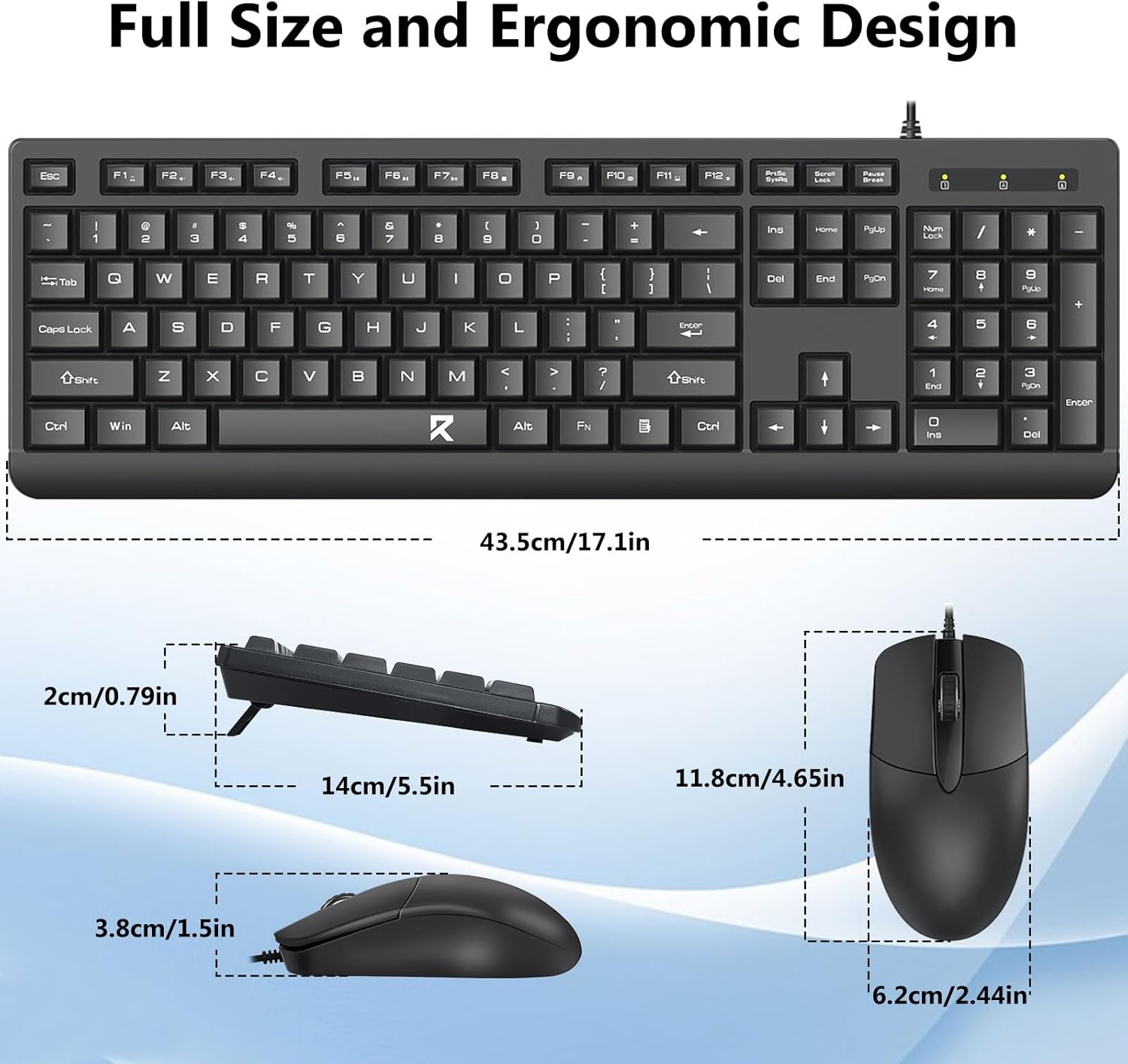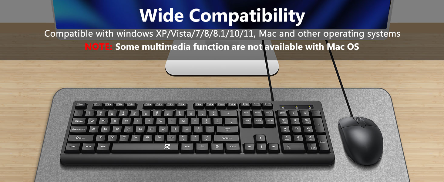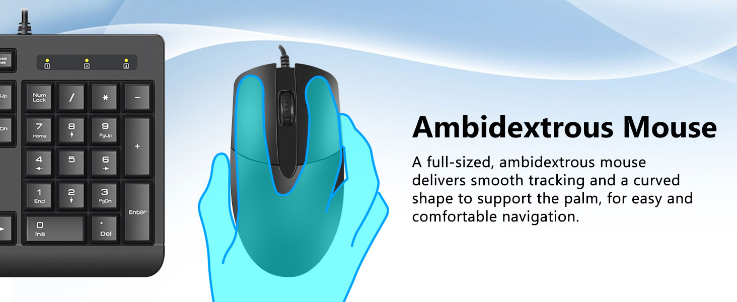 A teljes méretű billentyűzetkiosztás numerikus billentyűzetet, multimédiás billentyűket és kényelmes billentyűközt tartalmaz. A mellékelt egeret pontos követésre és zökkenőmentes kurzormozgásra tervezték különböző felületeken.