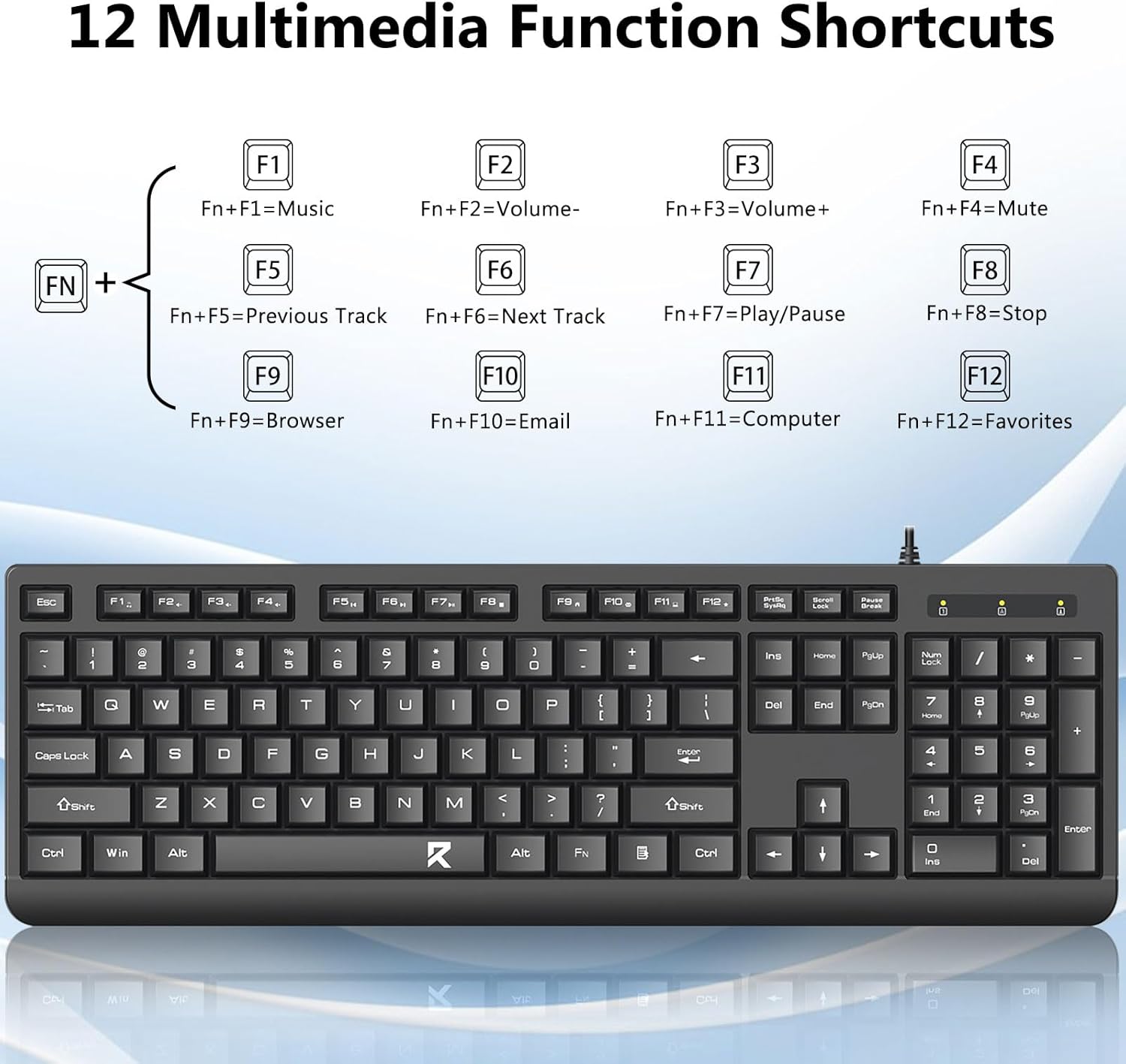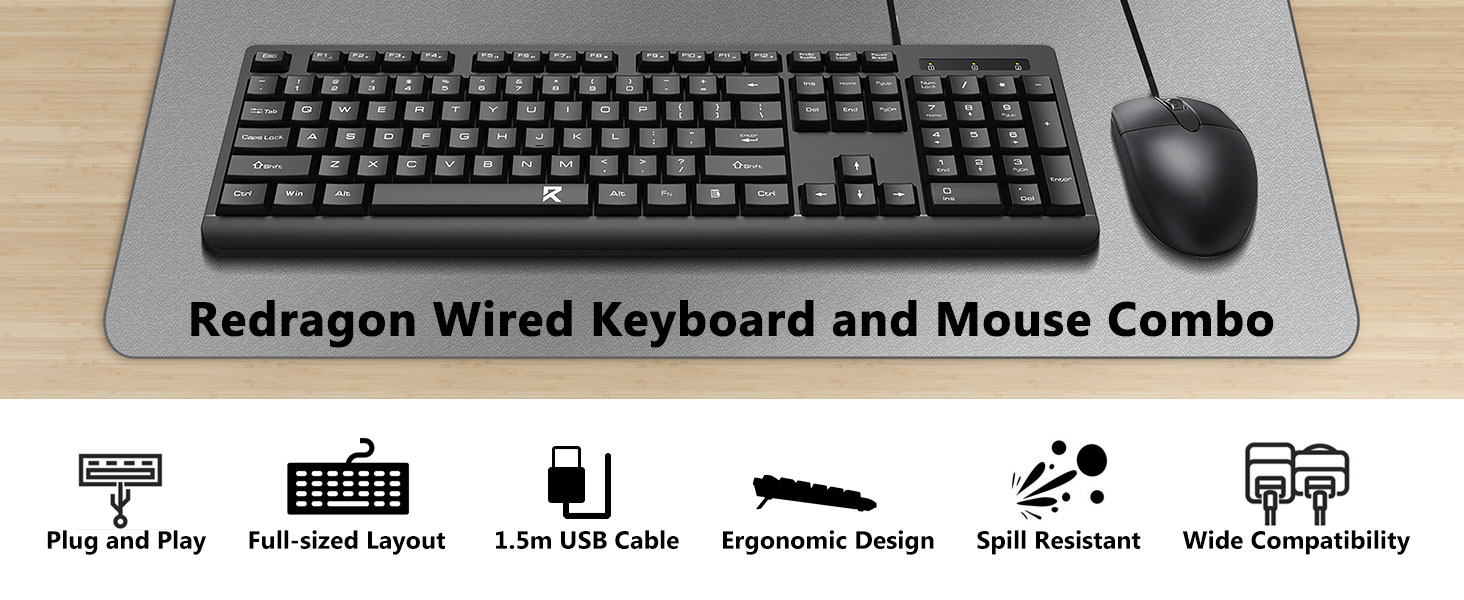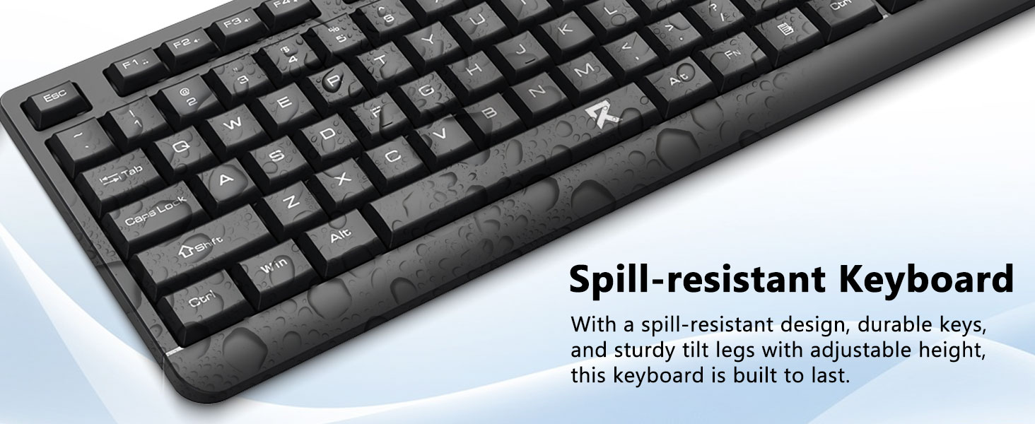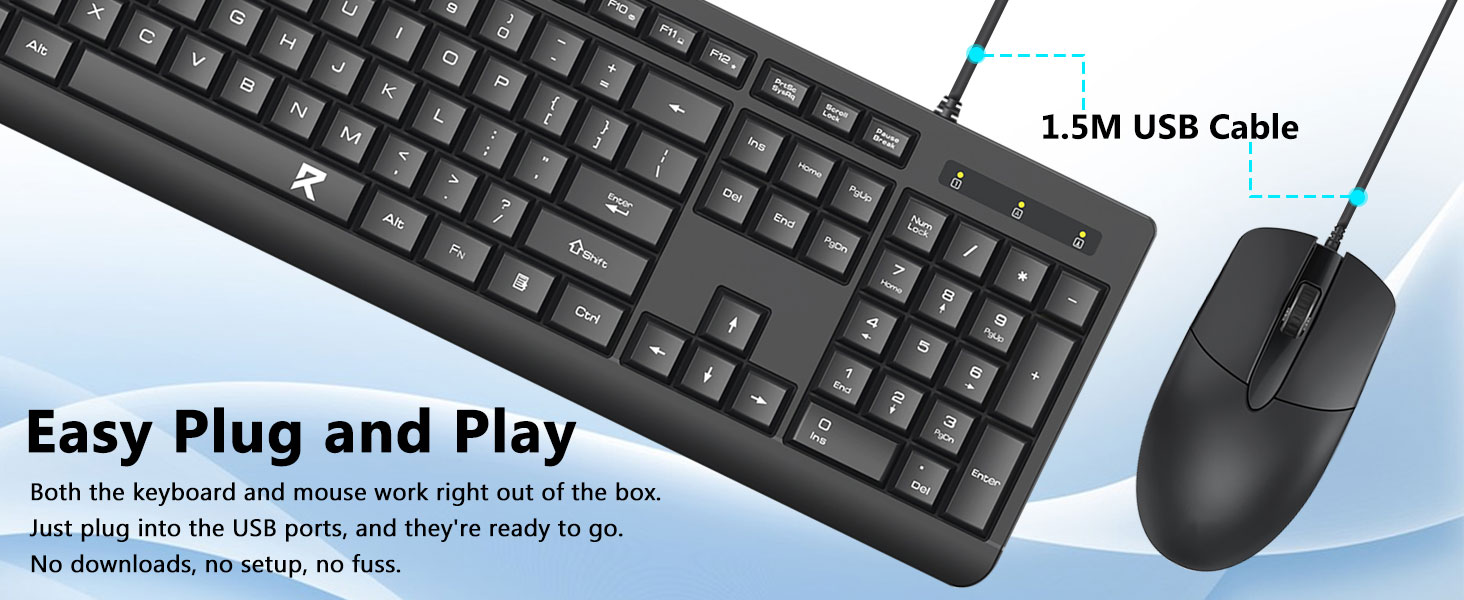 A teljes méretű billentyűzetkiosztás numerikus billentyűzetet, multimédiás billentyűket és kényelmes billentyűközt tartalmaz. A mellékelt egeret pontos követésre és zökkenőmentes kurzormozgásra tervezték különböző felületeken.
