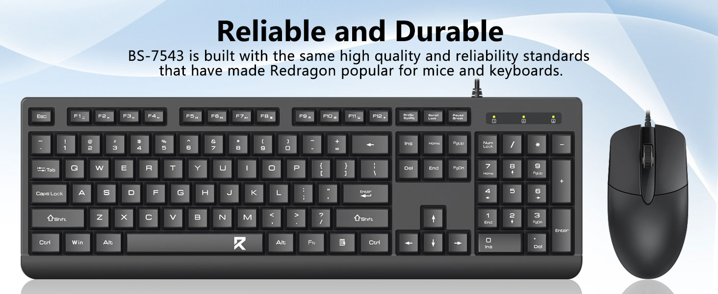 A fekete BC7543 vezetékes billentyűzet és egér kombináció szabványos teljes méretű billentyűzetkiosztással rendelkezik, beleértve a dedikált numerikus billentyűzetet. Ez az elrendezés ideális irodai feladatokhoz, például adatbevitelhez, pénzügyi munkákhoz és táblázatkezeléshez.