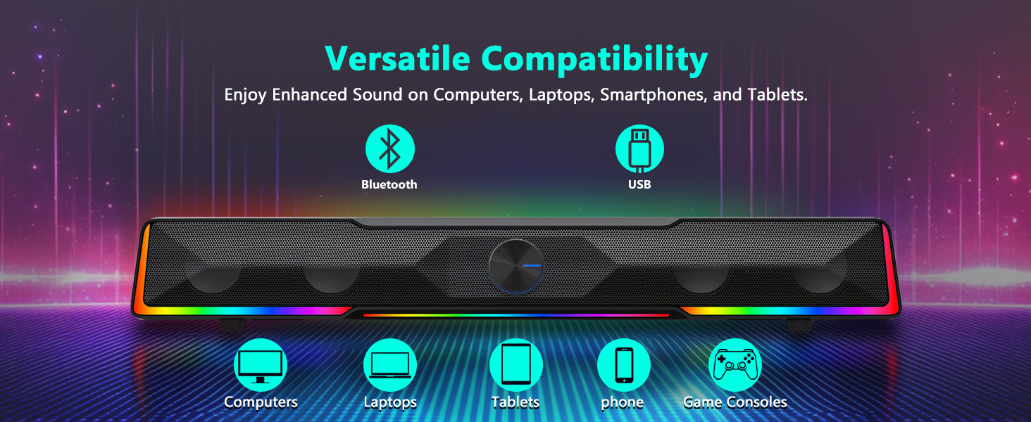 Kompatibilis eszközök A fekete GS516 Bluetooth/USB vezetékes csatlakozású Soundbar hangerőszabályzó számítógépes hangszórót úgy tervezték, hogy sokféle eszközzel működjön. A kompatibilis eszközök általában a következők: