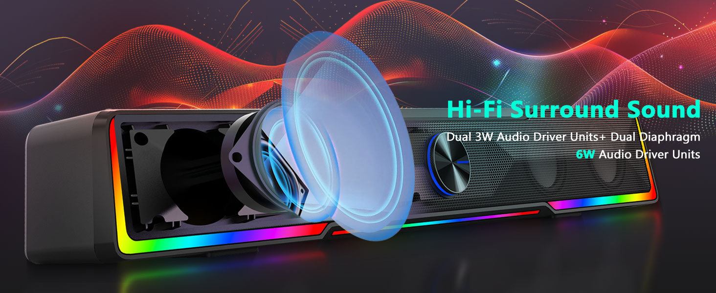 Kiváló minőségű sztereó hang A nagy teljesítményű sztereó meghajtókkal felszerelt fekete GS516 Bluetooth/USB vezetékes csatlakozású Soundbar hangerőszabályzó számítógép-hangszóró kiegyensúlyozott hangzást biztosít tiszta énekhanggal, részletgazdag középsávval és fokozott mélyhangválaszokkal. A hangszórót úgy tervezték, hogy magával ragadó hangot biztosítson többféle tartalomhoz, beleértve a filmeket, játékokat, podcastokat és zenét.