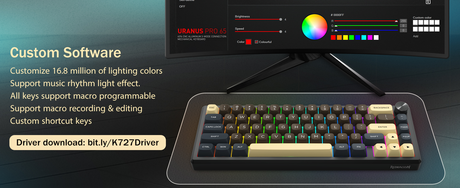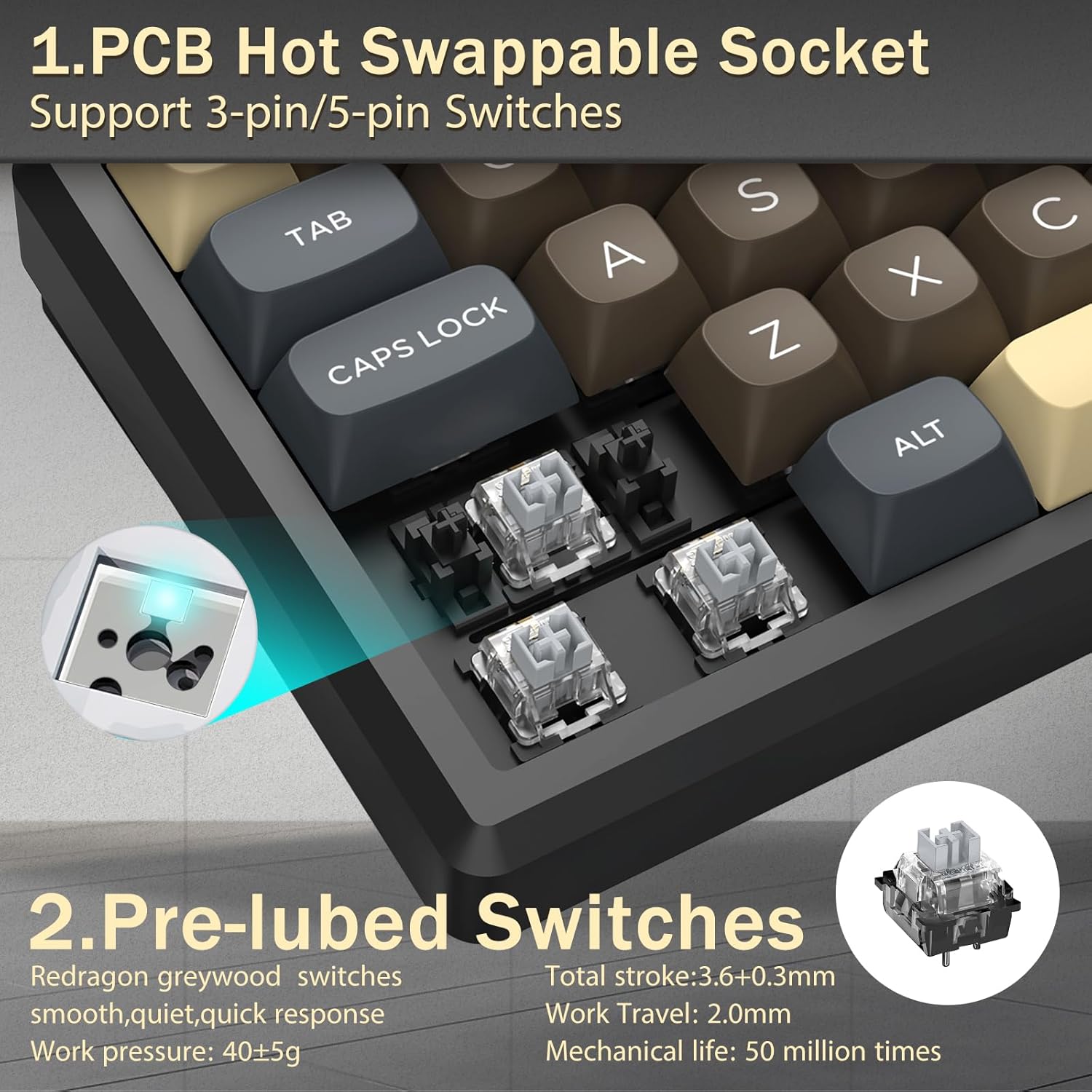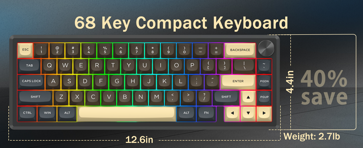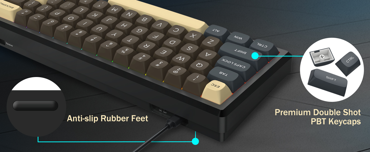 60%-os elrendezésével ez a billentyűzet eltávolítja a nem alapvető billentyűket, miközben a billentyűkombinációk révén megtartja az alapvető funkciókat. Ez a kialakítás segít csökkenteni az asztali zsúfoltságot, és több helyet biztosít az egér mozgásának, így alkalmas játék- és termelékenységi környezetre egyaránt.