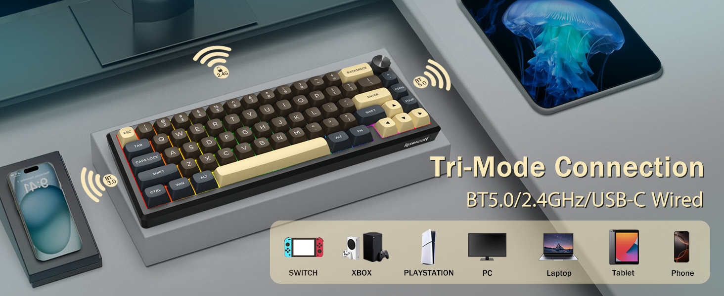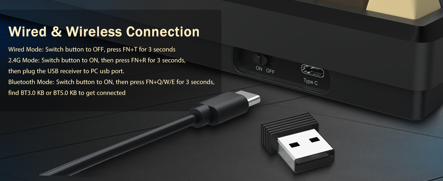 A billentyűzet támogatja a vezeték nélküli kapcsolatot a kényelem érdekében, és a vezetékes USB-kapcsolatot a stabil teljesítmény érdekében. A felhasználók a beállításoktól függően válthatnak a módok között.