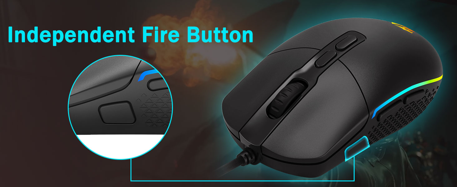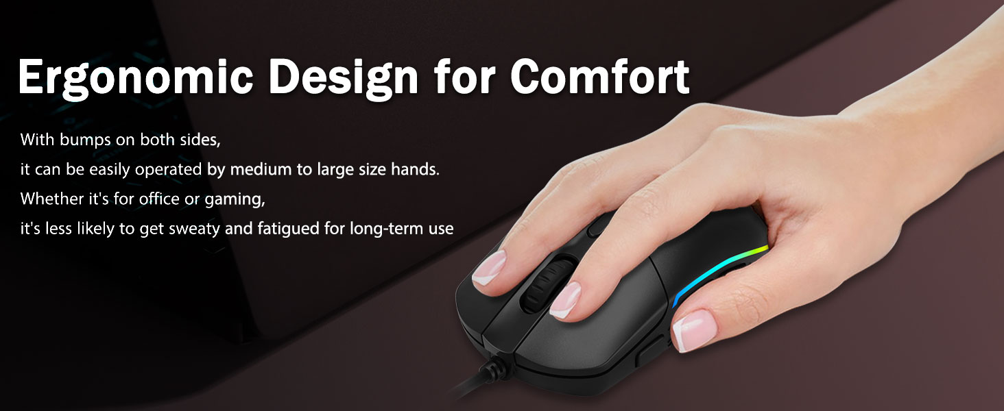 Comfort Grip- A mindkét oldalon található ergonomikus dudoroknak köszönhetően a gamer egerek bármilyen kézbe illeszkednek. Hosszan tartó kényelmet biztosít a játékosok számára, fáradtság nélkül még hosszú órákon át tartó intenzív játék közben is. Nem csúszik el, amikor felemeli a játékhoz tartozó egeret, vagy gyors és precíz mozdulatokat hajt végre.