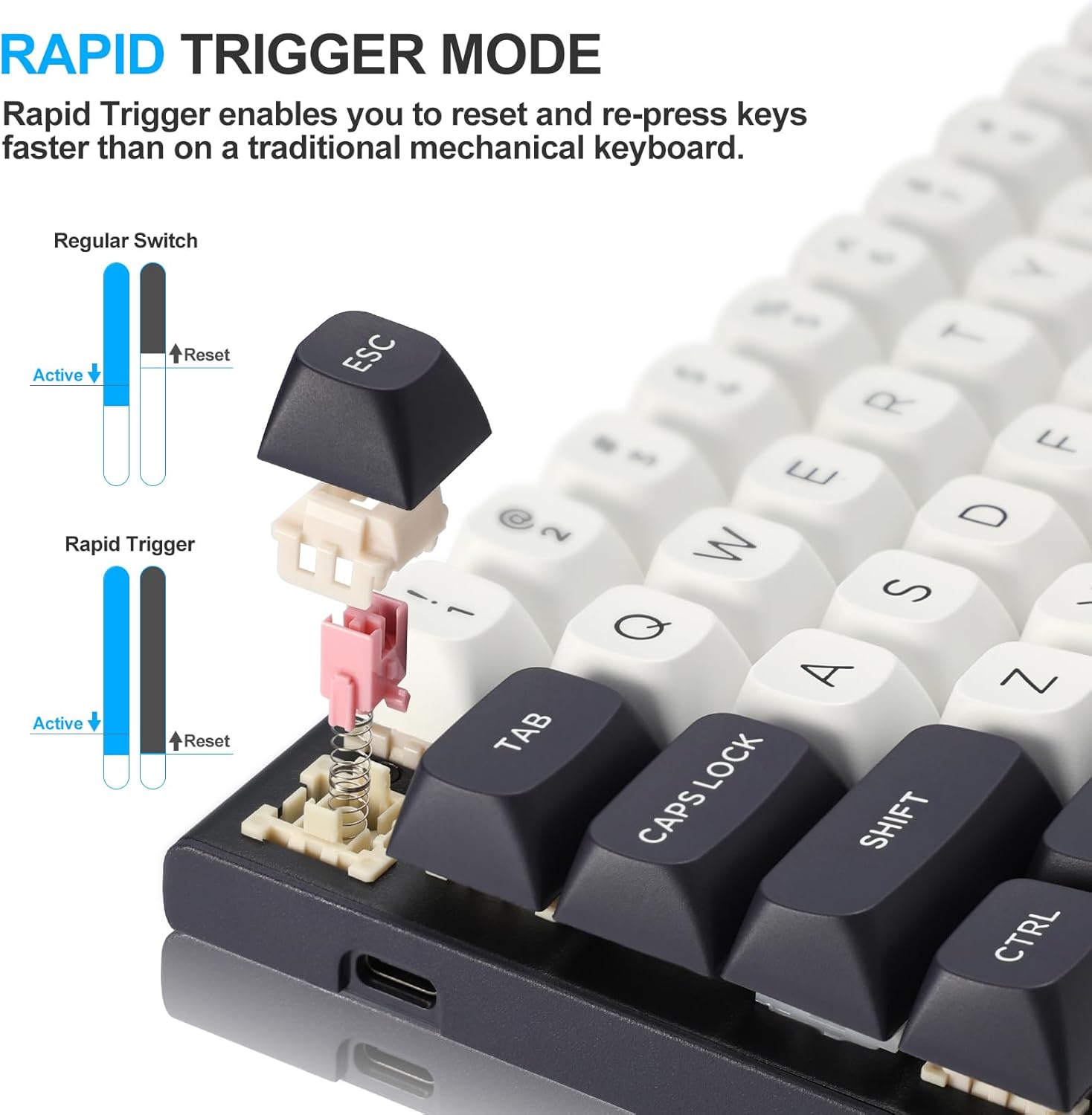 A Rapid trigger funkció lehetővé teszi a billentyűk azonnali alaphelyzetbe állítását, amikor elengedik, ahelyett, hogy egy rögzített visszaállítási pontra várnának. Ez gyorsabb ismételt billentyűleütéseket és precízebb vezérlést tesz lehetővé, ami különösen hasznos versenyszerű játékoknál, mint például az FPS vagy a ritmusalapú játékok.