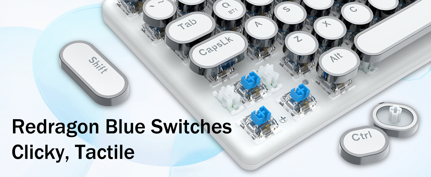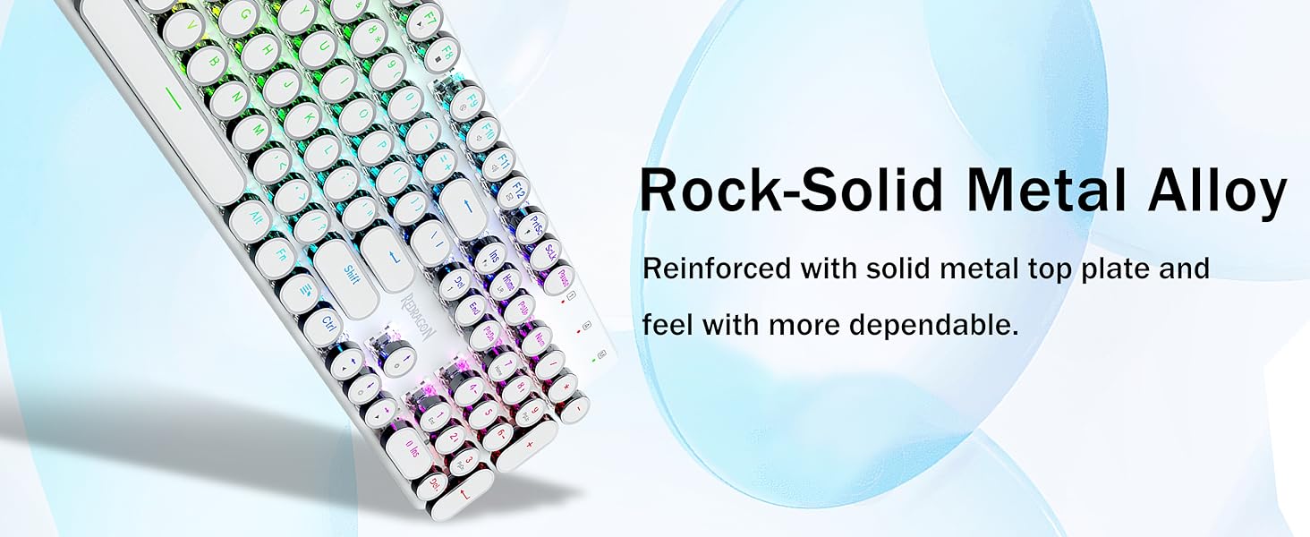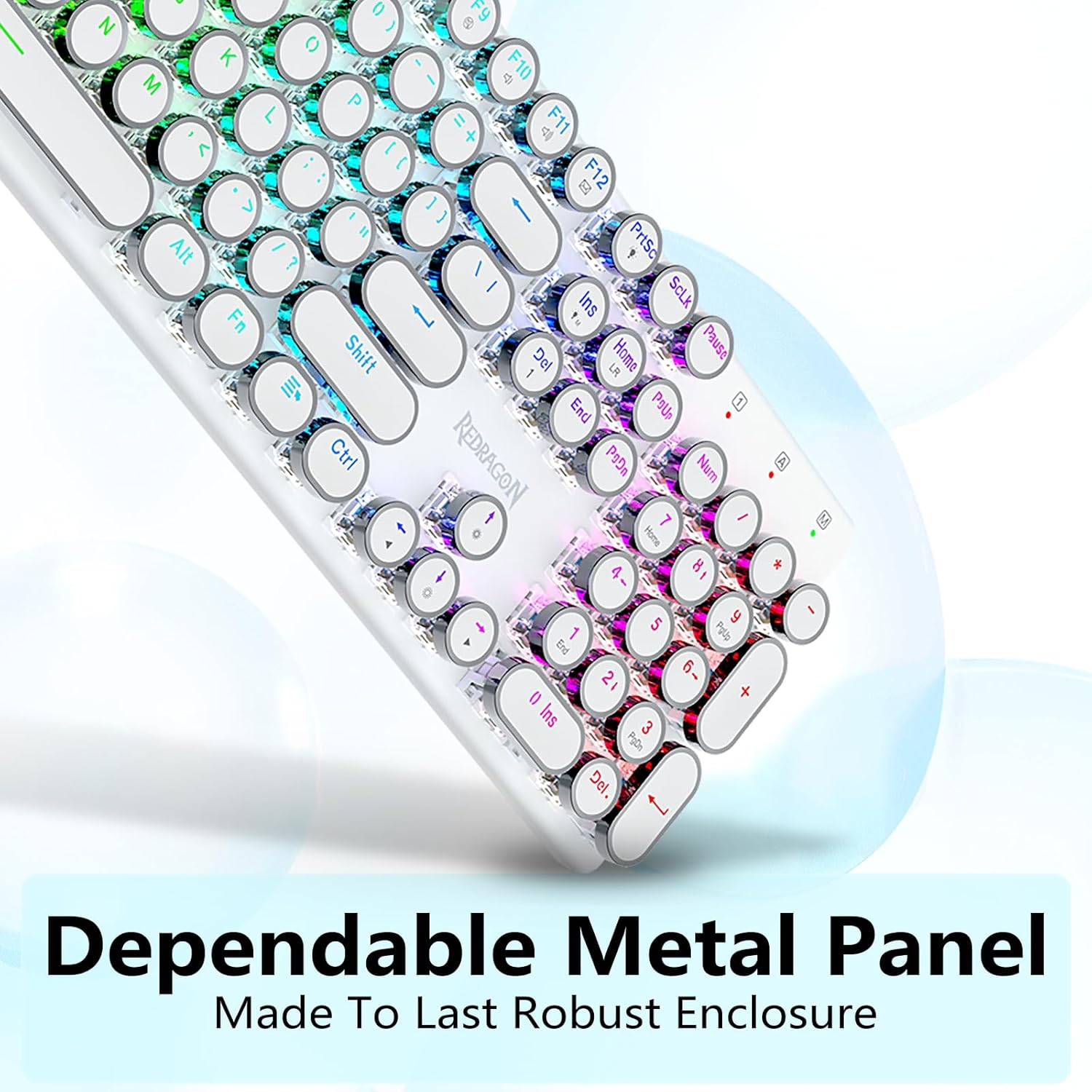 𝗥𝗲𝘁𝗿𝗼 𝗧𝘆𝗽𝗲𝘄𝗿𝗶𝘁𝗲𝗿 𝗦𝘁𝘆𝗹𝗲 𝘄𝗶 𝗠𝗲𝗰𝗵𝗮𝗻𝗶𝗰𝗮𝗹 𝗞𝗲𝘆𝘀- A Redragon Mechanical kék kapcsolók közepes ellenállást, hallható kattanási hangot és tapintható visszajelzést kínálnak, érzékeny és precíz játékkörnyezetet és teljesítményt biztosítanak. A vintage steampunk billentyűzet kerek billentyűsapkái úgy néznek ki, mint egy klasszikus írógép, kényelmes gépelési érzést és stabil kattintási tapintást biztosítanak.