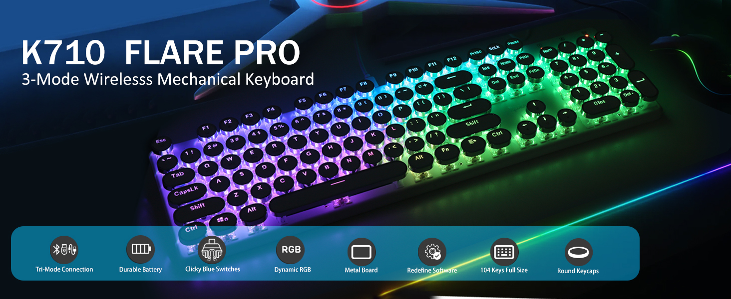 𝗗𝗲𝗽𝗲𝗻𝗱𝗮𝗯𝗹𝗲 𝗠𝗲𝘁𝗮𝗹 𝗣𝗮𝗻𝗲𝗹 és 𝗔𝗻𝘁𝗶 𝗚𝗵𝗼𝘀𝘁𝗶𝗻𝗴- A továbbfejlesztett FLARE PRO verzió továbbra is ugyanazt a tankszilárd fémanyagot használja. Tartsa stabilan és elegánsan a billentyűzetet az asztalon a prémium gépelési élmény érdekében. A K710 billentyűzet támogatja a 104 billentyűs anti-ghosting technológiát, amely lehetővé teszi több billentyű egyidejű lenyomását konfliktus nélkül.