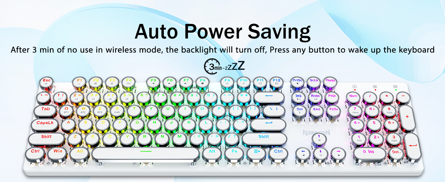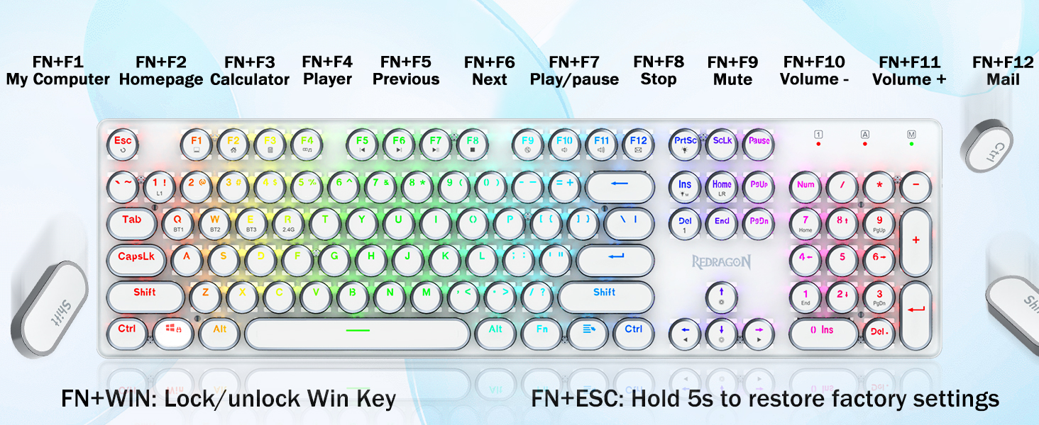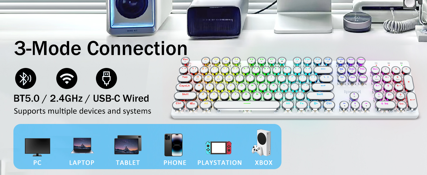 𝟯-𝗠𝗼𝗱𝗲 𝗖𝗼𝗻𝗻𝗲𝗰𝘁𝗶𝗼𝗻- Redragon innovatív hárommódusú csatlakozási technológiával, USB-C vezetékes, Bluetooth 3.0/5.0 és 2,4 GHz vezeték nélküli módokkal, amelyek a felhasználói élményt minden területen magasabb szintre emelik. Nyomja meg az FN+Q/W/E billentyűkombinációt a Bluetooth módhoz, az FN+R billentyűkombinációt pedig a 2,4G módhoz.